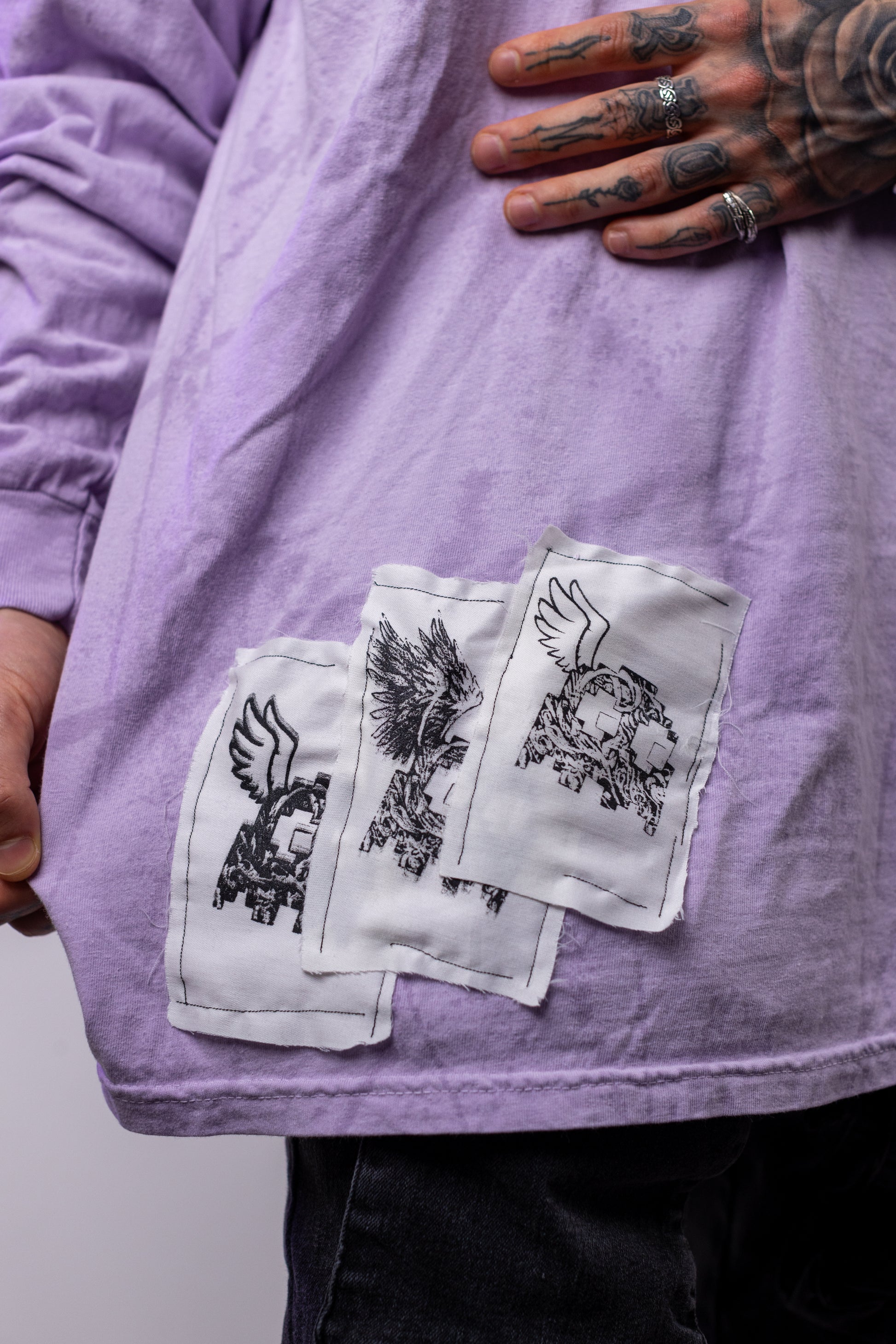 - Three ghost patches on the bottom right side of the shirt